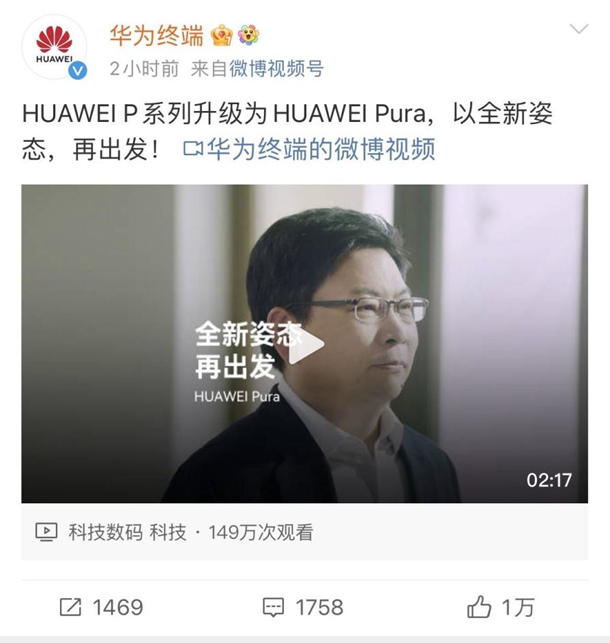 在这则视频中,华为常务董事、终端BG CEO余承东宣布,华为P系列正式升级为“华为Pura”,将以全新姿态再出发,而原定的P70将会是新系列的第一款产品。