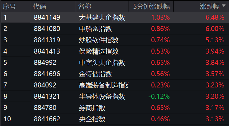 截至记者发稿时,沪指涨1.16%,创业板指涨2.24%,深成指涨1.53%。白酒、保险、煤炭、工程机械、铁路基建等权重板块集体走强。目前,A股总市值超3000亿公司仅紫金矿业一股飘绿,五粮液大涨5%,中国移动、贵州茅台均涨超2%。黄金、旅游、酒店餐饮等前期强势的板块则集体调整。