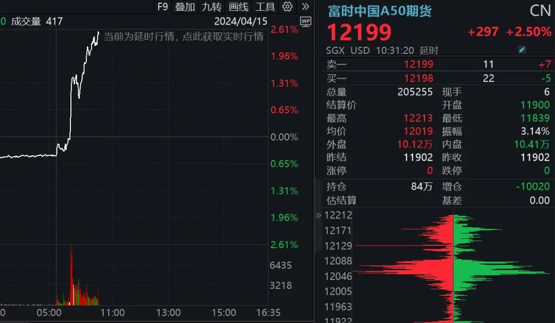 虽然盘中沪指一度跳水翻绿,但富时中国A50指数期货并没有出现跳水。值得关注的是,外资持续涌入抄底。开盘20多分钟时间,北向资金就净买入超100亿元。另外,富时中国A50指数期货涨幅扩大至2.5%,突破12200点。