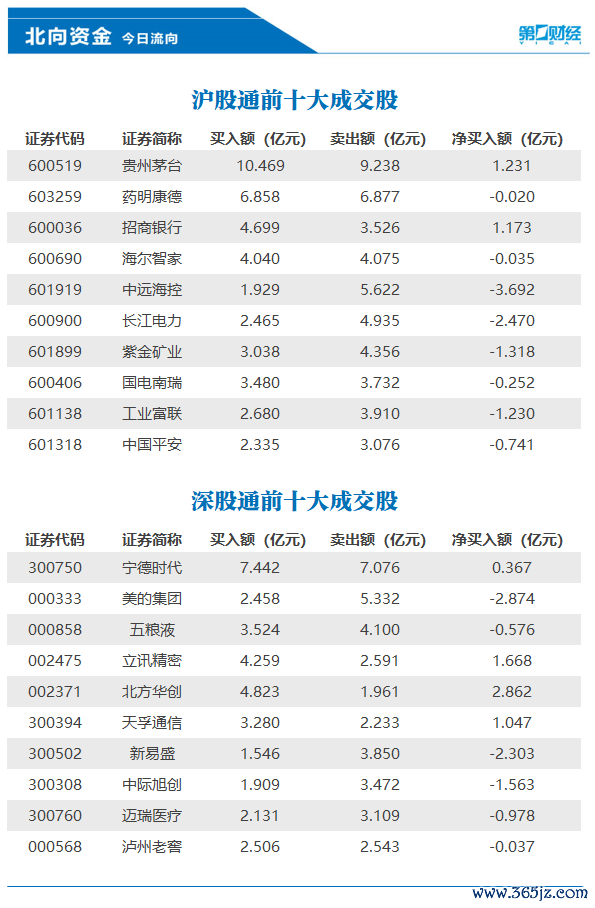 前十大成交股中,净买入额居前三的是北方华创、立讯精密、贵州茅台,分别获净买入2.86亿元、1.67亿元、1.23亿元。
